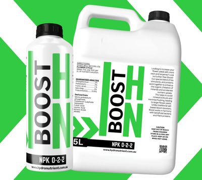 Looking to increase your flower yields with more resin and terpenes? Look no further than Boost! Our special blend of bio stimulants, and proteins work together to enhance the organic chelation of minerals and accelerate nutrient uptake. This helps to avoid mineral lockouts and minimise flushing, leading to larger flower yields. Unlike traditional salt-based bloom boosters.